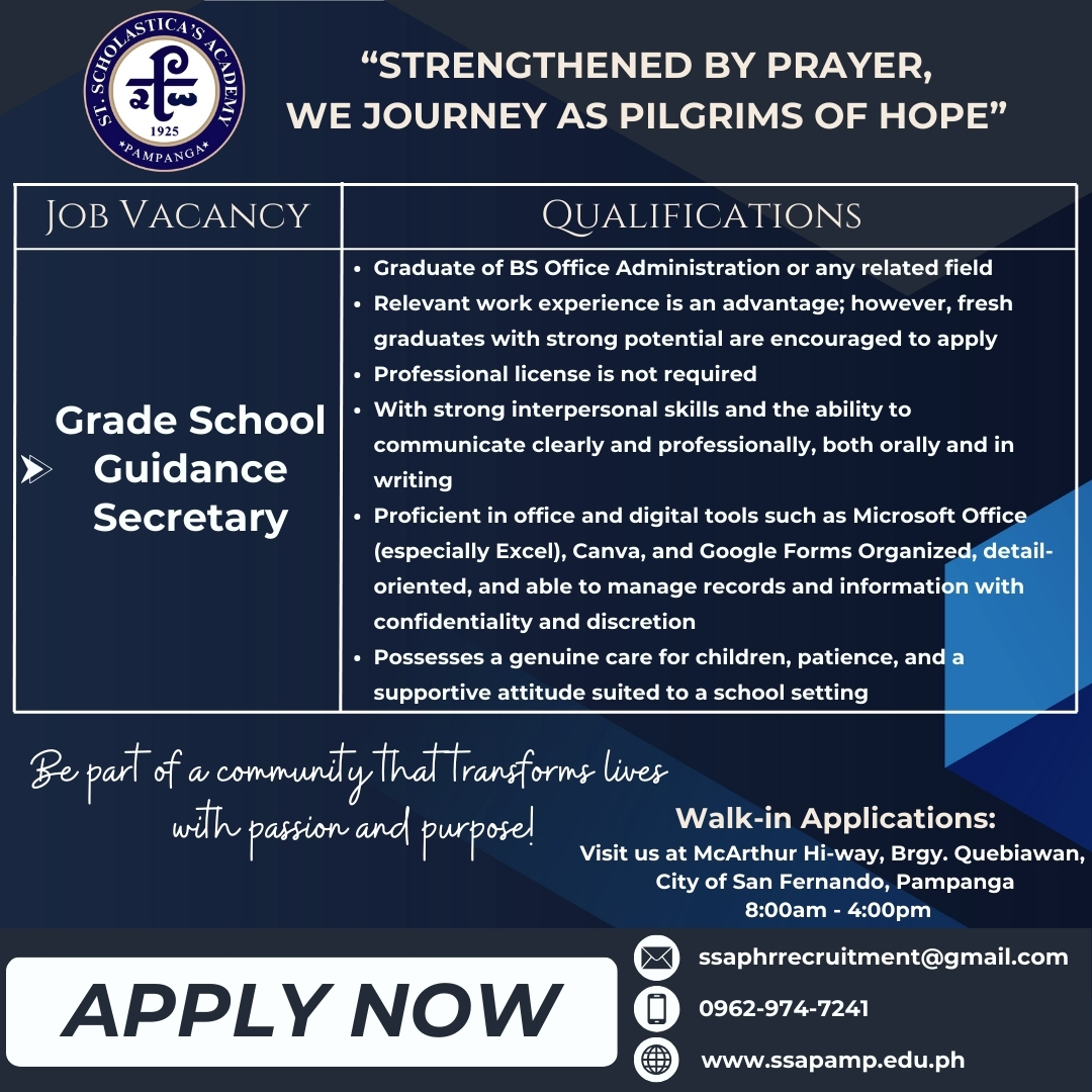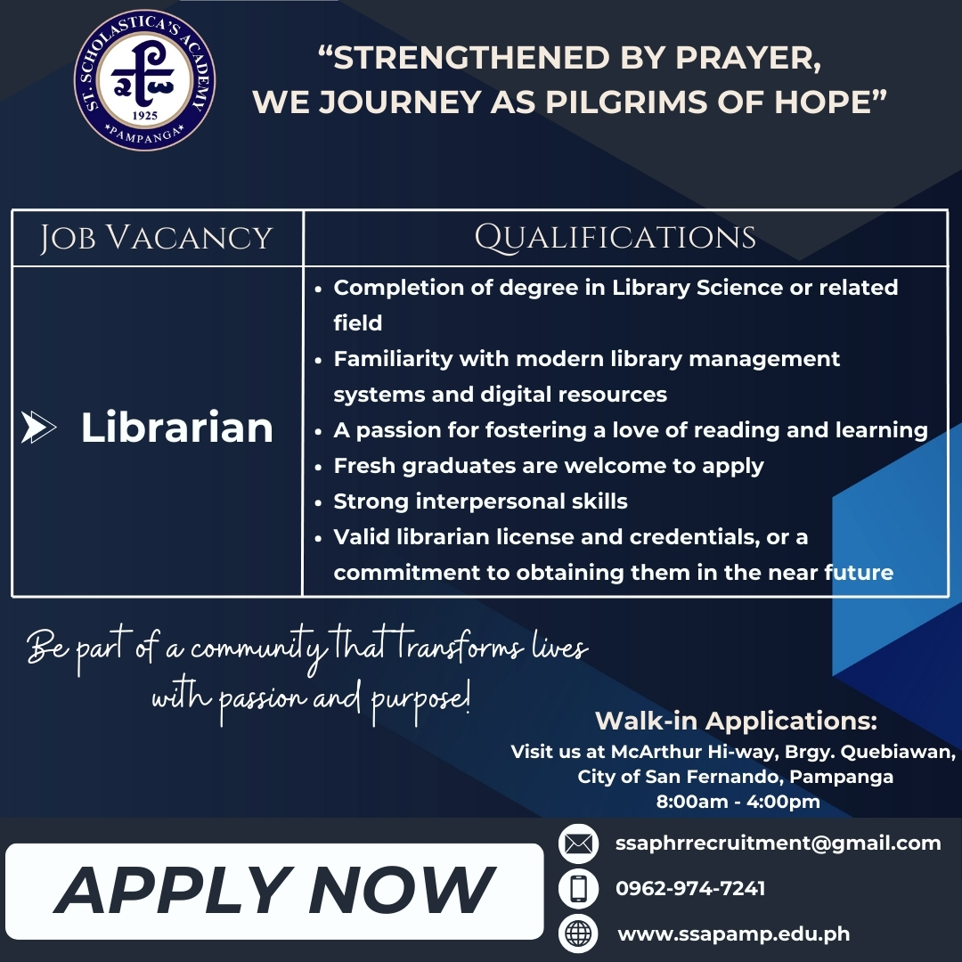 At St. Scholastica’s Academy Pampanga, we are committed to nurturing young minds and fostering an environment of excellence, compassion, and innovation. We are currently seeking dedicated and passionate professionals to join our community in the following role: